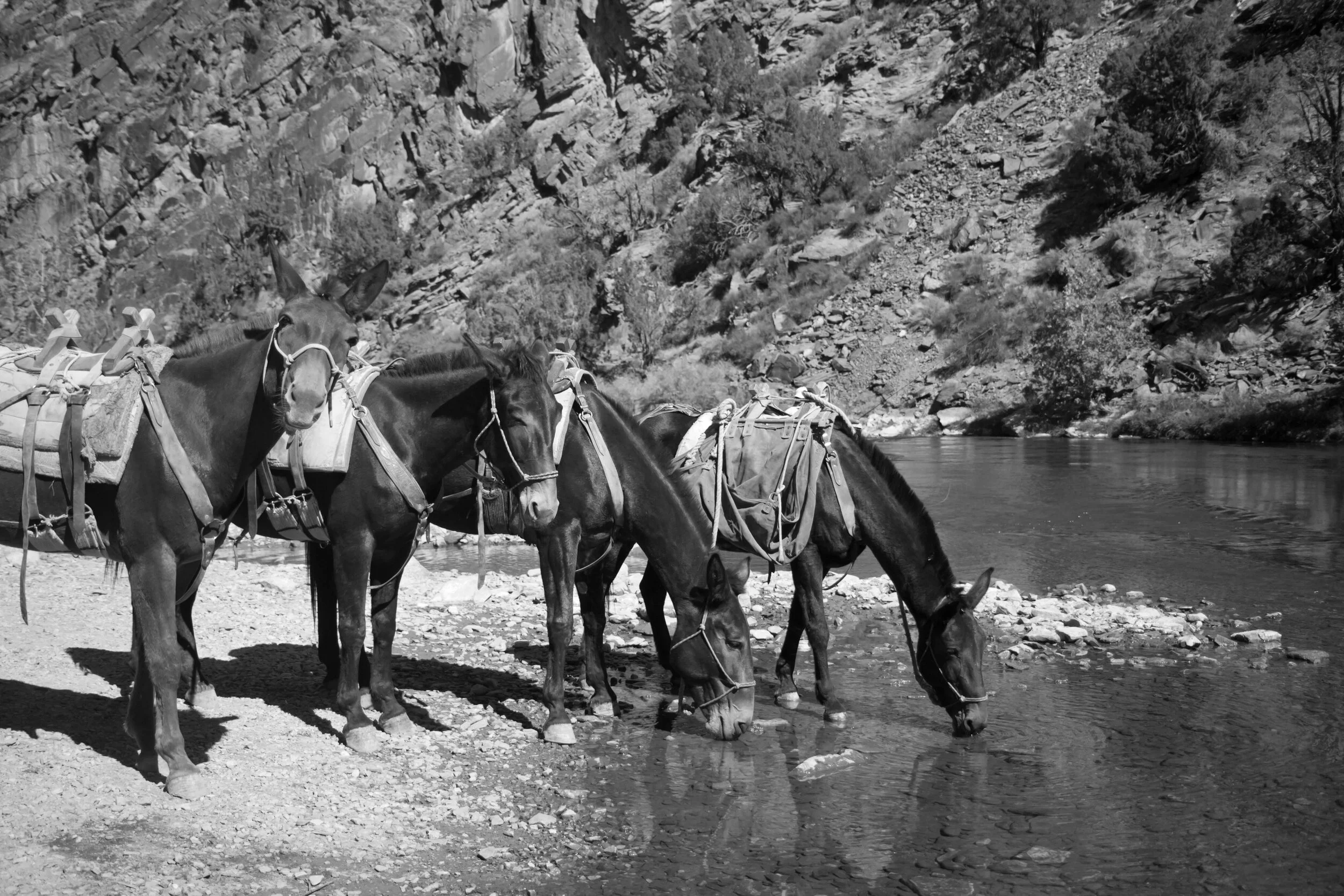 Mules bring gear into canyon.